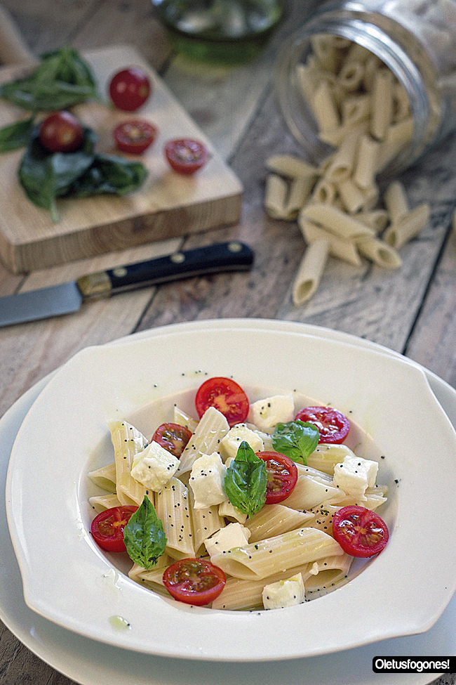 Tags: albahaca fresca, macarrones, mozzarella de bufala, semillas de amapola, tomates cherry